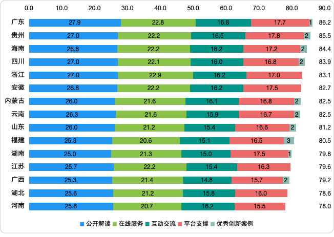 省(自治区、直辖市)政府中,13家位于“优秀”梯度,14家位于“良好”梯度。