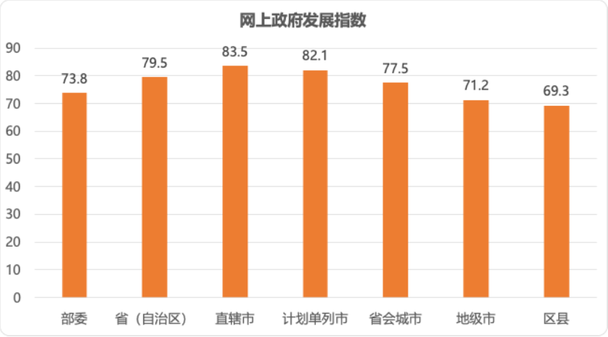报告指出,网上政府承载着开放透明、公平普惠的建设使命,是表征政府及各部门政务公开和公共服务能力水平的风向标、晴雨表。人工智能时代的到来,为网上政府的建设创造了更广阔的发展空间,更加有助于提升政府公信力、政策参与度、服务能力、应急处置能力、传播动员能力。2025年网上政府创新发展调查对象覆盖部委、省(自治区、直辖市)、计划单列市、省会城市、地市级和区县级政府,合计684家。结果显示,不同层级和地区网上政府的发展指数差异较大,直辖市为83.5,计划单列市82.1,省(自治区)79.5,省会城市77.5,部委73.8,地级市71.2,区县(直辖市、副省级城市所辖区县)69.3。