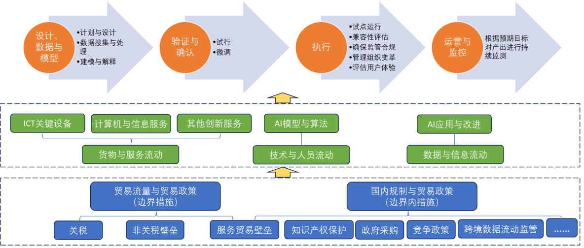 国际贸易对数字技术会产生怎样的影响?国际贸易如何赋能数字技术的发展呢? 这里我们提供了一个分析的框架,来考察国际贸易对人工智能(AI)生命周期的影响(如图2)。
