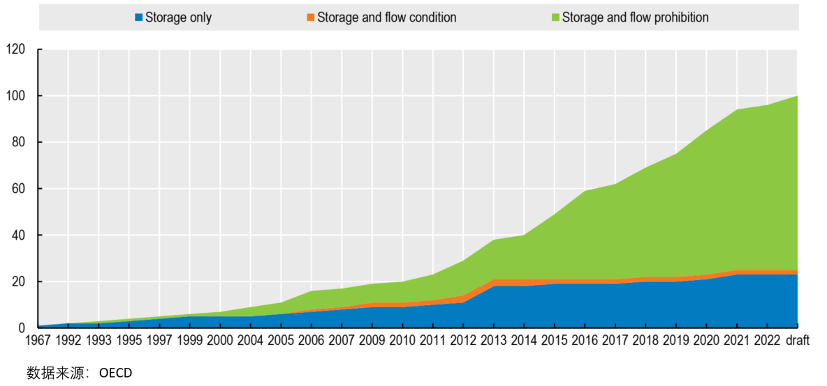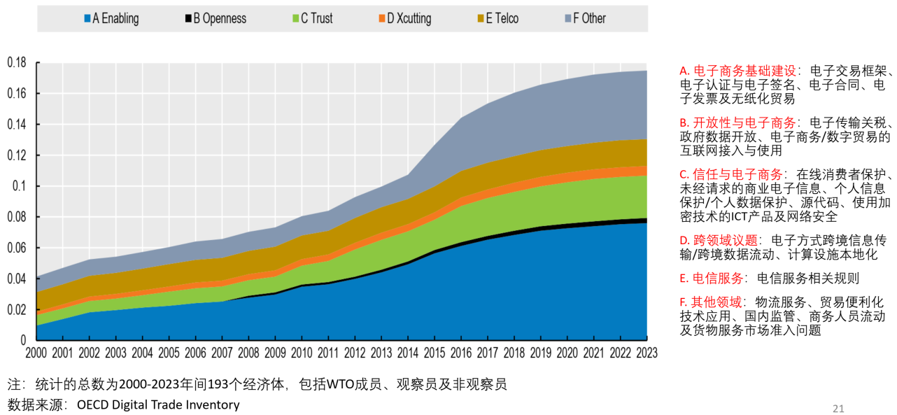 二是数字服务贸易壁垒。数字贸易的未来趋势是数字服务贸易,即可以通过数字交付和传输的服务产品。目前各国都存在对数字服务贸易的壁垒限制。OECD建造了“数字贸易限制指数”(DSTRI)及相关的数据库对这些限制进行监控与评估。限制壁垒包括基础设施与连通性、电子交易、支付体系、知识产权与其他五个方面。其中,基础设施与连通性是最主要的限制措施(全球层面上占所有限制措施数量的约2/3,中国层面上占约50%),核心内容包括个人数据的跨境传输禁止与限制、数据本地化存储要求以及对电信服务的限制。因此,逐步约束与消除数字服务贸易壁垒可以有力地赋能数字技术与服务的发展。